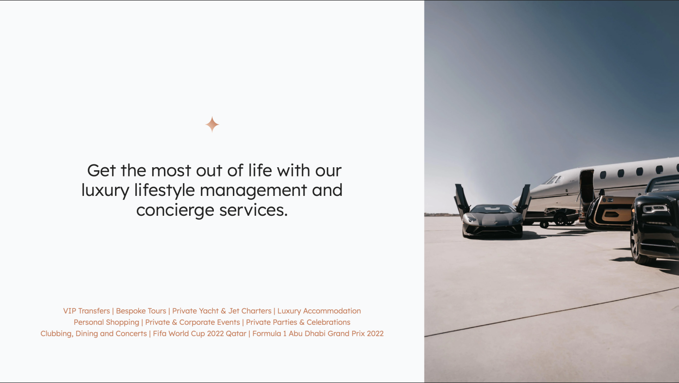 Lifestyle Management | VIP Transfers, Private Jets & Yachts, Bespoke Tours, Luxury Stays, Personal Shopping |